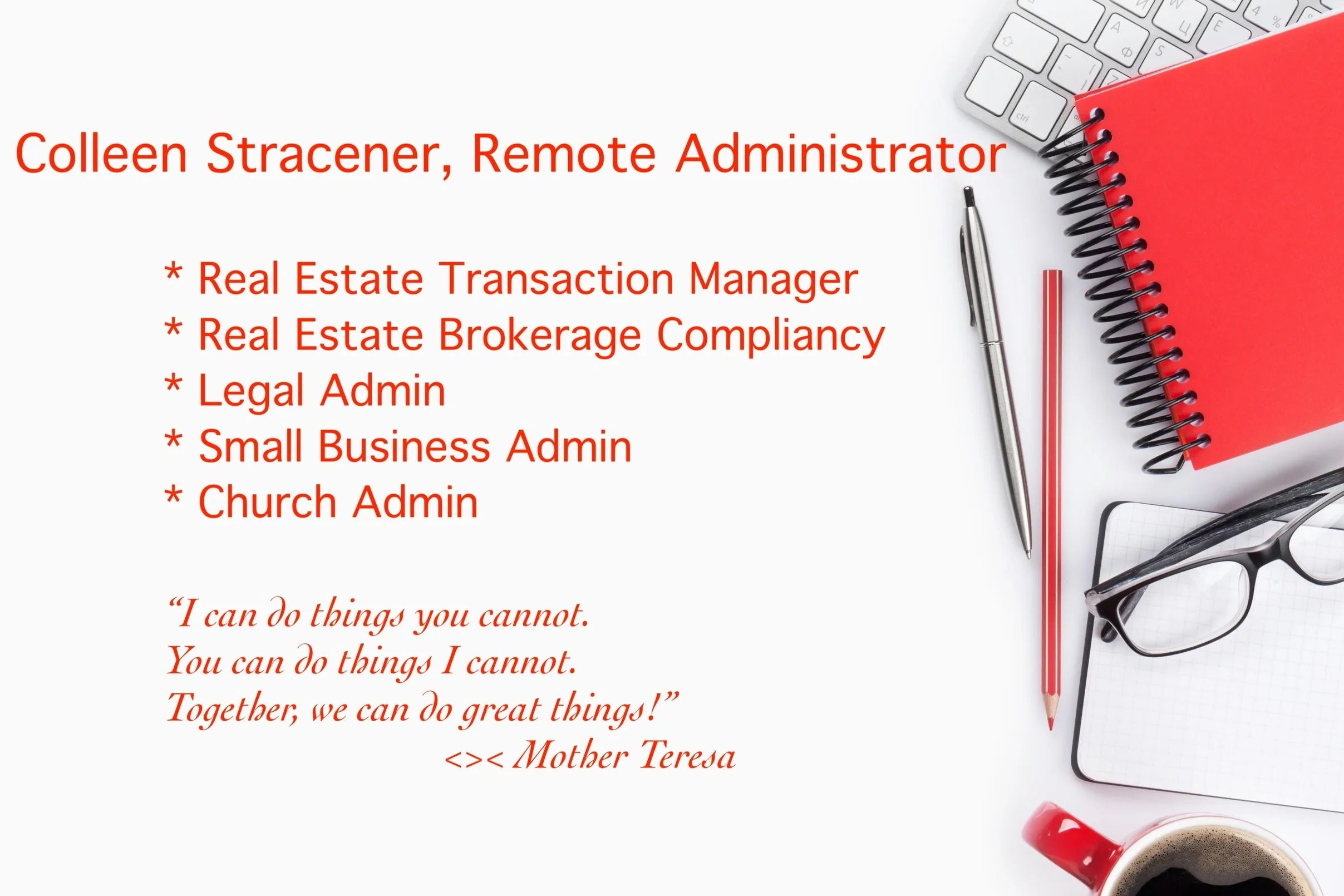 As a remote administrator with a solid background as a legal secretary specializing in real estate and probate, I am uniquely positioned to streamline your administrative tasks, allowing you to focus on what you do best—practicing law. By leveraging my expertise in document preparation, client communication, and case management, I can enhance your office's efficiency and organization. Imagine having a dedicated professional to handle the details of administrative work, ensuring that deadlines are met and files are maintained with meticulous care. Let’s work together to optimize your workflow and elevate your practice, freeing you to concentrate on your clients and grow your business.